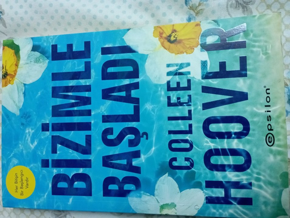 Colleen Hoover'un "Bizimle Başladı" romanı, duygusal derinliği simgeleyen mavi kapakta beyaz ve sarı çiçekler içeriyor.