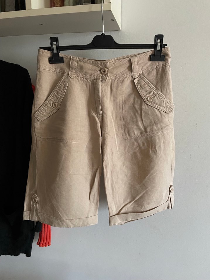 Keten ve pamuk kumaş. Çok temiz, sayılı giydim. Arka ve yan cepler aktif. 39 cm bel, 54 cm boy. 1.70 boyda dizüstü. #CollezioneBejKetenBermudaŞort #CollezioneBejKetenPamukBermudaŞort #BejKetenBermudaŞort