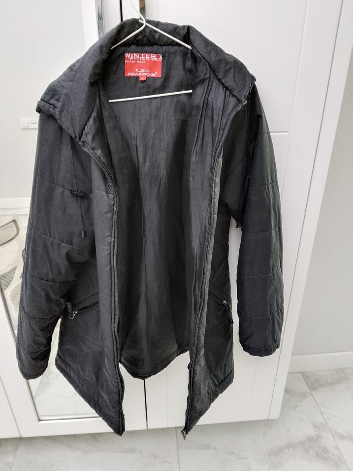 Collezione marka. Yumuşak kumaştan, fermuarlı, notched lapel yakalı, uzun kollu, siyah midi boy fitted ceket. Şapkası çıkartılarakta kullanılabilir.Ön fermuarı arızalı olup değiştirilerek kullanılabilir.Başka bir sorunu yok.