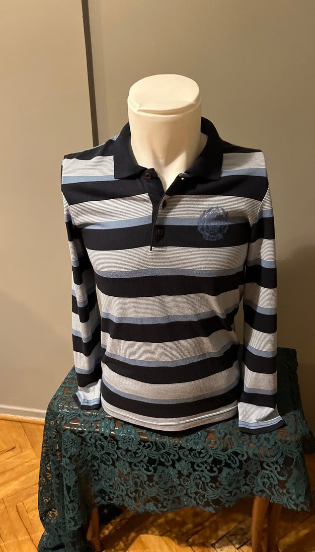 Bu dar kesim erkek polo tişörtü, uzun kollu, düğmeli yakalı ve gri tonlarında çizgili desenlidir. Sokak stiline uygun rahat bir parça.
