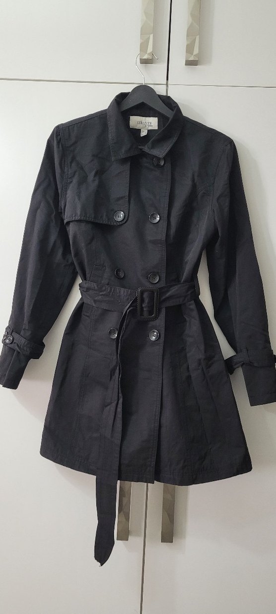 collezione yağmurluk trençkot. temiz giyildi, beklediği yerde kırışmış başka sorunu yok. Kemerli ve yakası kesik detaylı, siyah renkli, midi boy, minimal goth tarzında