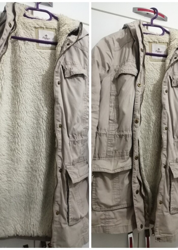 Ürün içi çıkabilen gerekirse trençkot olabilen 2türlü kullanılan mont kol kısmında ufak defosu var ama giymeye engel değil