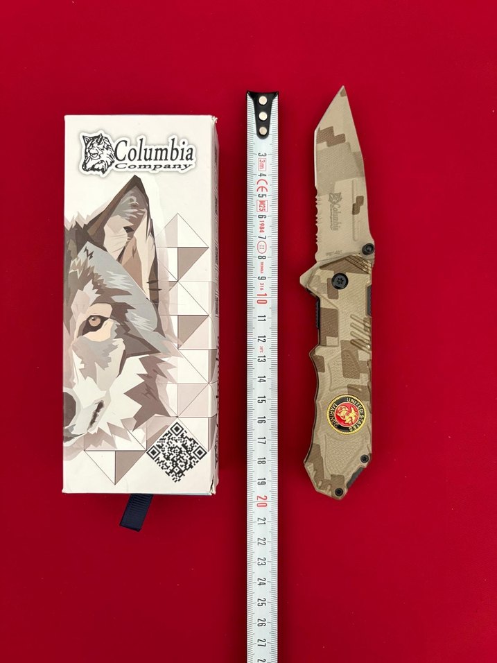 Columbia katlanır bıçak, koyu kamel kamuflaj deseni ve tırtıklı bıçağı ile sağlam bir yapıya sahiptir. Uzunluğu yaklaşık 23 cm'dir. ️