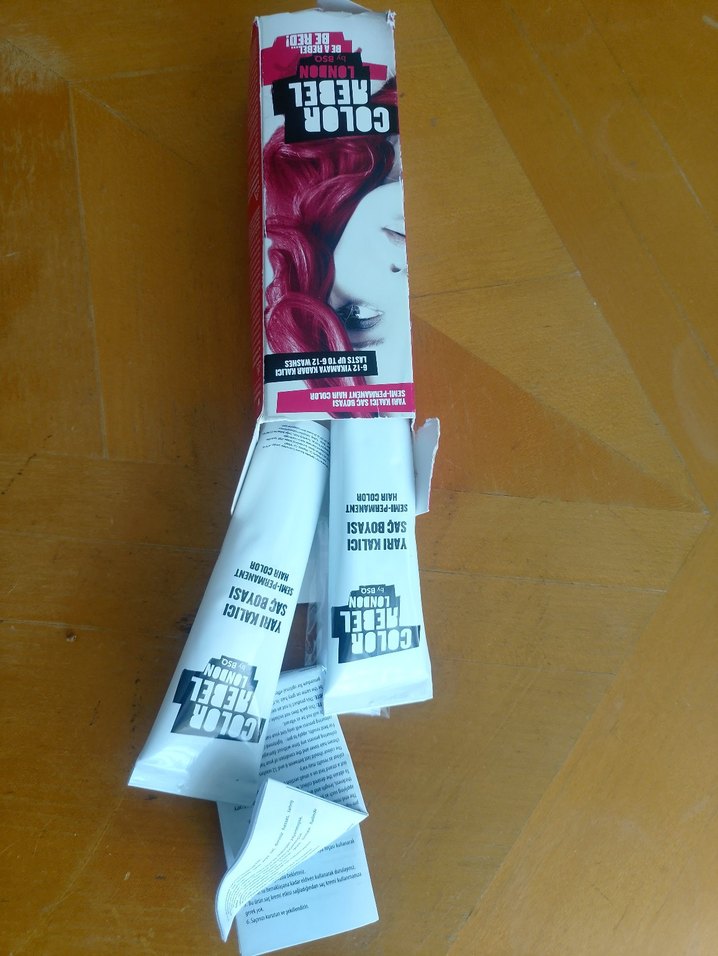 Color Rebel London saç boyası seti, canlı kırmızı renk kremi ve oksidan içerir. Parlak ve kalıcı renk sağlar. iki tüp var