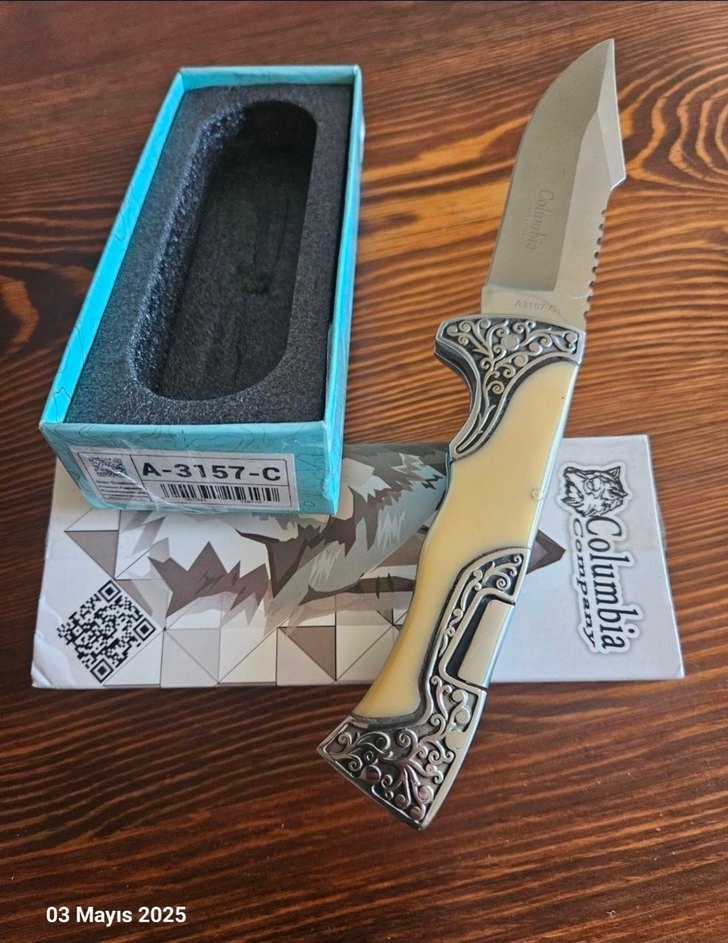 Columbia, kemik/gravürlü çelik kabze, sırttan kilitli, kemer klipsli, devasa boyda av, kamp çakısı.