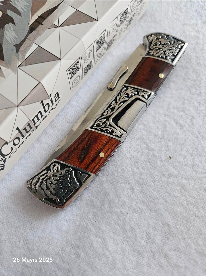 Columbia, sırttan kilitli, kemer klipsli, 25cm'lik süper çakı. Columbianın en uzunu. Kabze kample gravür işlemeli ve ceviz kombinli.