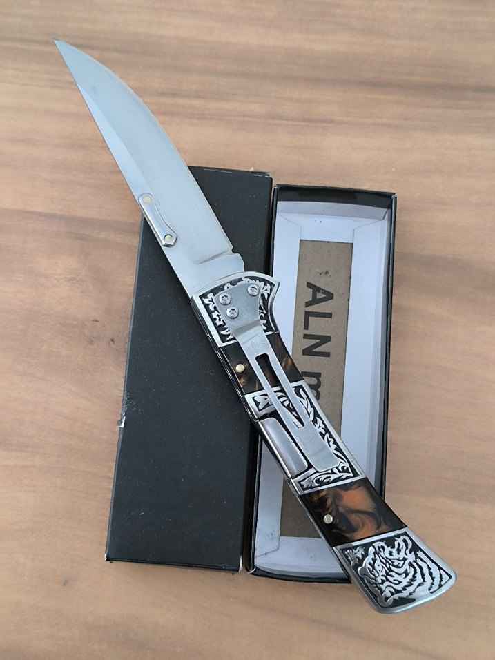 dünya tasarım ödüllü koleksiyonluk 4116 alman bohler celik sırttan kilitli gravür manyağı kaplan kabartmalı