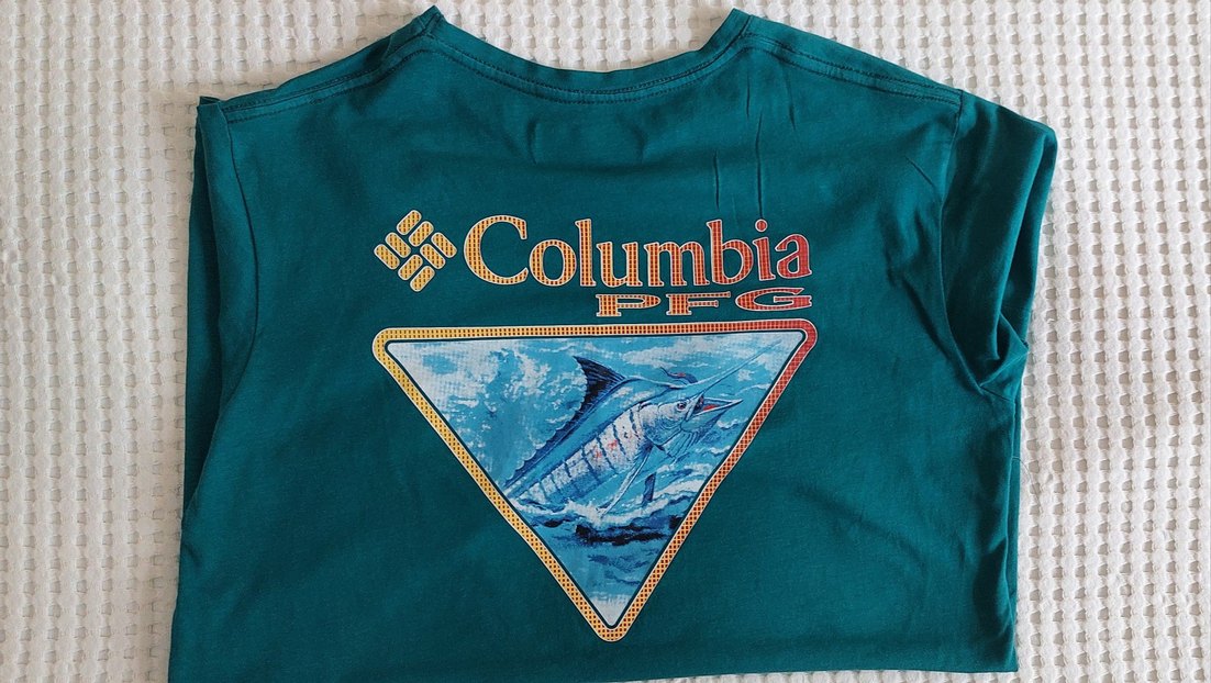 Turkuaz renkli, kısa kollu, bisiklet yaka, pamuklu ve fitted kesim erkek tişörtü. Columbia baskılı, dış mekan kullanıma uygun, fermuarlı detaylı.