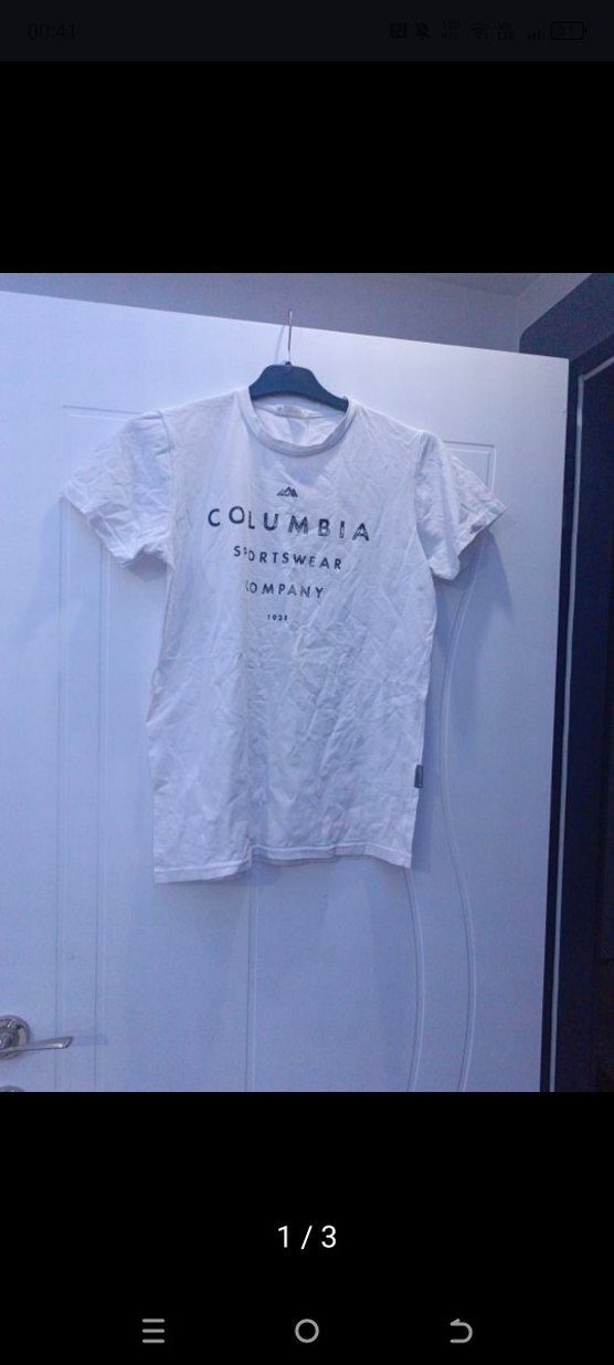 Columbia marka, pamuklu kumaştan kısa kollu, bisiklet yaka ve baskılı erkek tişörtü. Spor ve günlük kullanıma uygun, dar kesim.
