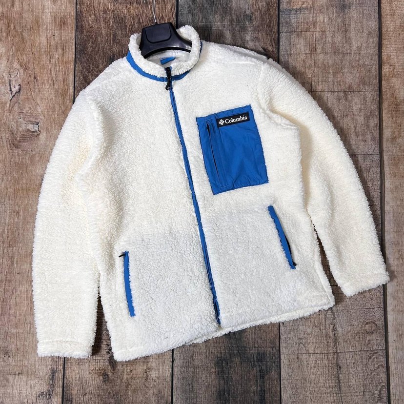 Columbia markalı beyaz erkek polar ceket, fermuarlı ön ve cepler, yuvarlak yaka ve bol kesim özelliklerine sahiptir. Kısa boyda, rahat ve yumuşak dokusuyla dış mekan için uygundur. Mavi detaylar trend bir görünüm sunar.