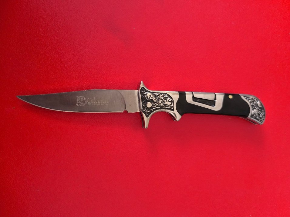 İşlemeli sapı ve keskin bıçağı ile kırmızı Columbia bıçak, şıklık ve işlevselliği bir arada sunar.