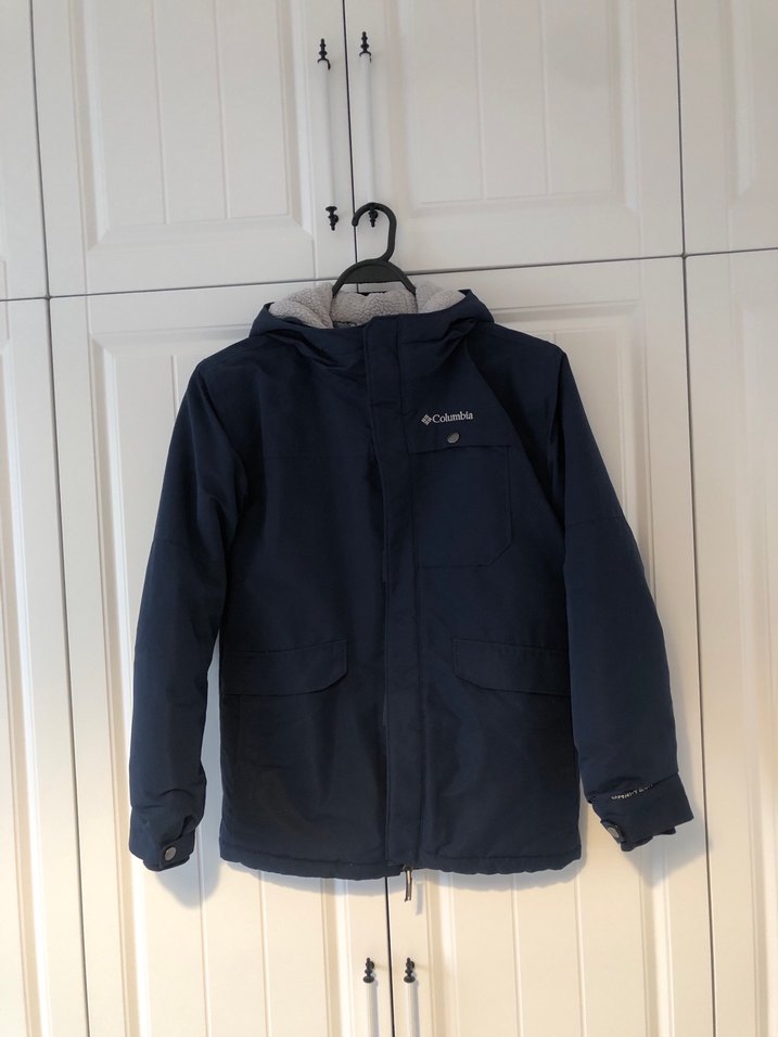 Columbia marka, fermuarlı, düz lacivert renkte, yumuşak ve sıcak kumaştan yapılmış, kapüşonlu erkek çocuk kabanı.