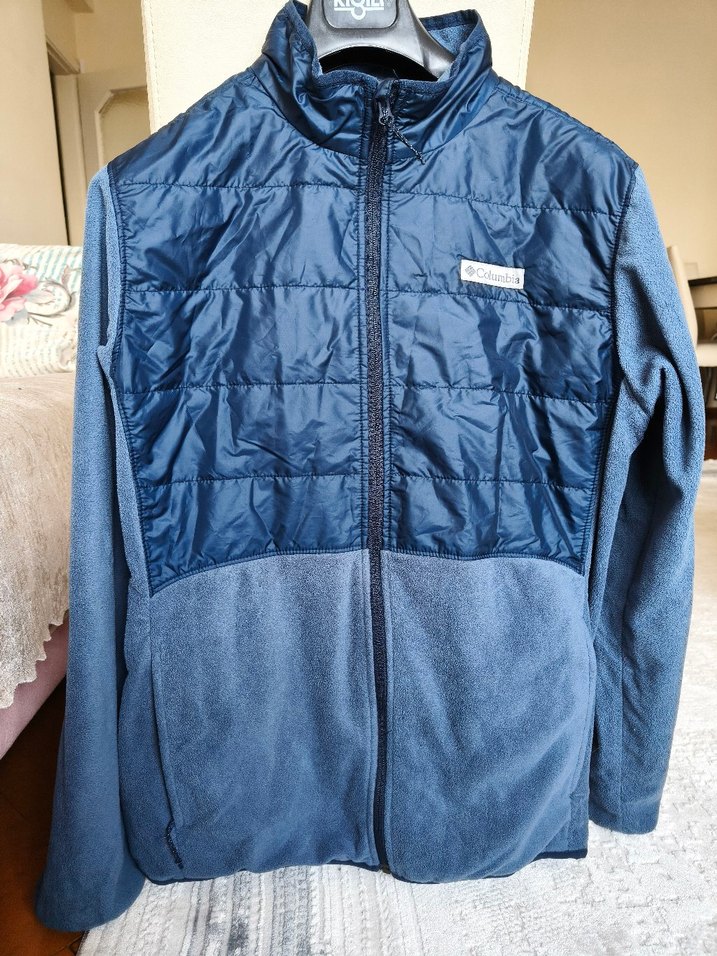 Columbia marka, mavi ve gri tonlarda, fermuarlı ve yüksek yakalı, uzun kollu, rahat kesim erkek polar cekettir.