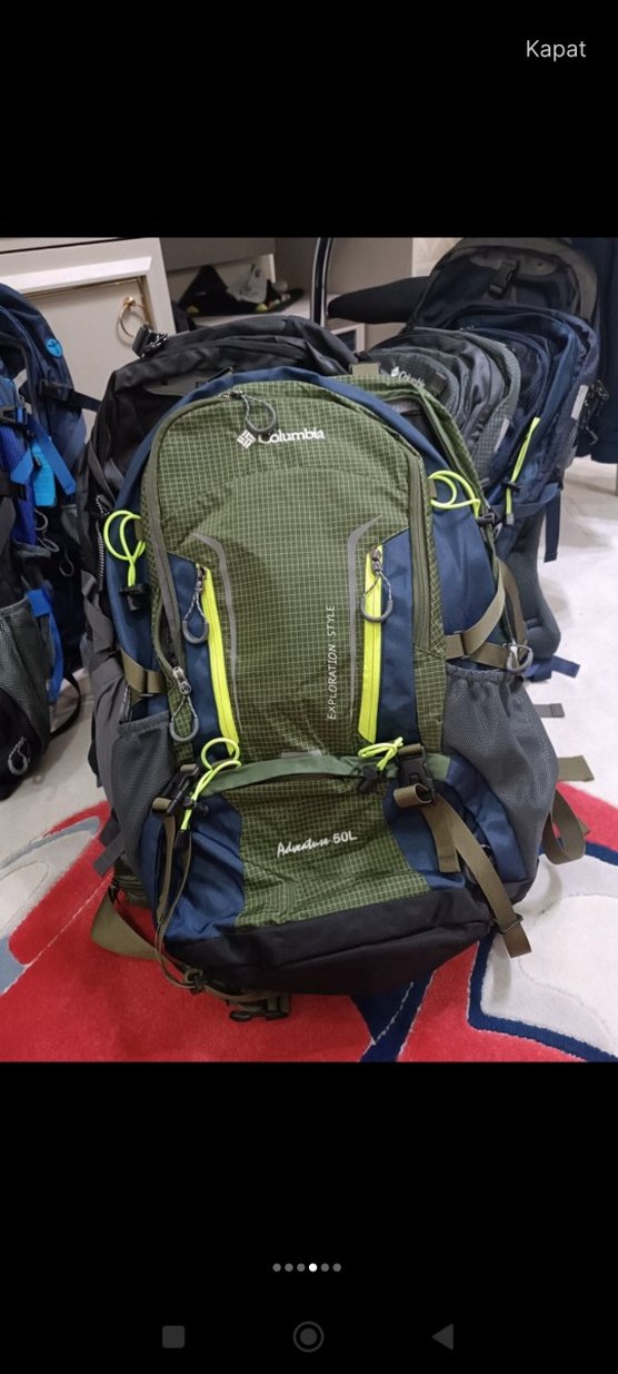 Columbia markalı, 50L kapasiteli, fermuarlı çok bölmeli koyu yeşil baskılı erkek sırt çantası. Athleisure ve biker tarzına uygun.
