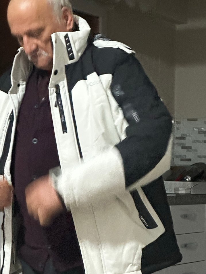 Fermuarlı cepleri ve kesimli yakası olan, uzun kollu midi boy, yumuşak ve sıcak kumaştan yapılmış beyaz-siyah erkek mont.