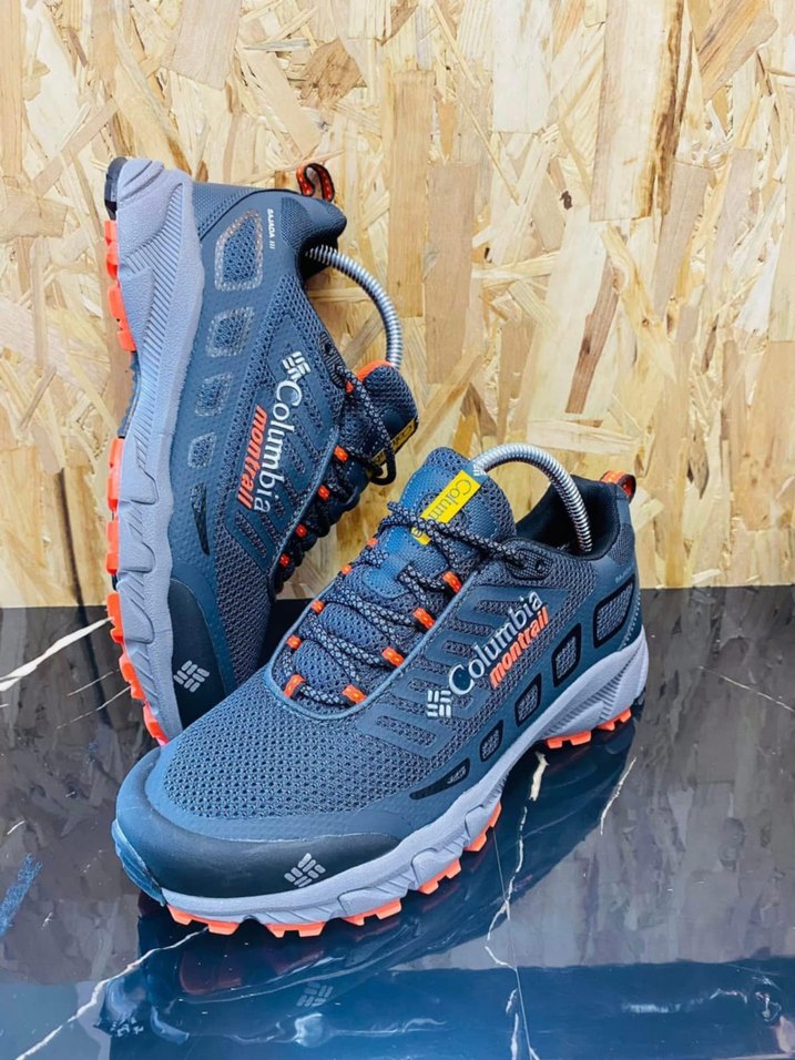 Columbia gri renkli, baskılı detaylı erkek spor ayakkabısı, Velcro bantlı ve kauçuk tabanlı, spor ve sokak stiline uygun.