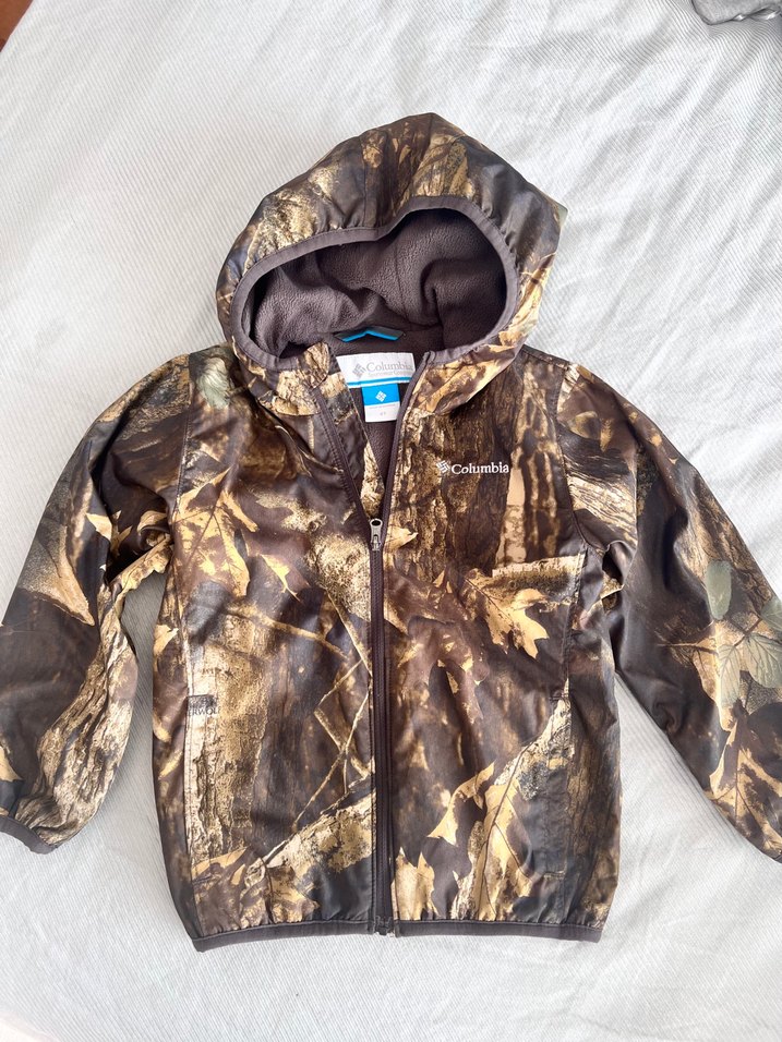 Columbia markalı, kapüşonlu ve fermuarlı erkek çocuk ceketi, koyu kahverengi kamuflaj desenlidir ve yumuşak, sıcak kumaştan üretilmiştir. İçi polardır Pandemi sebebiyle hiç giyilmedi Sıfır