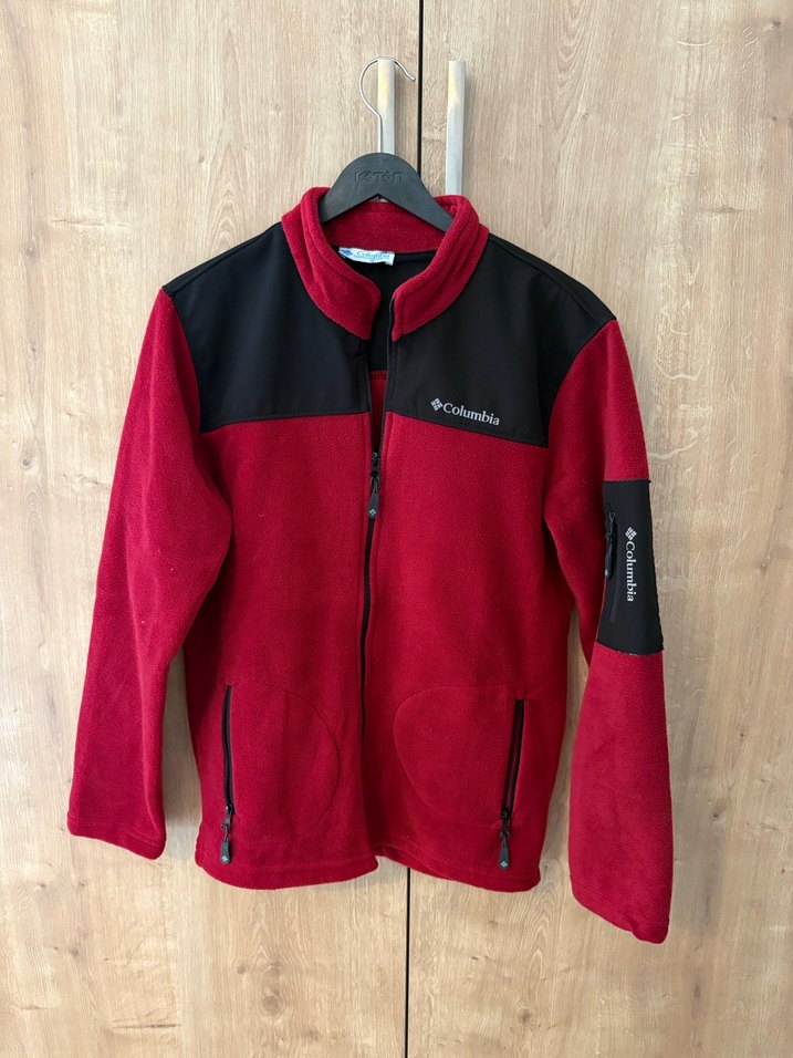 Columbia markalı, fermuarlı, uzun kollu, bisiklet yakalı, kırmızı ve siyah baskılı polar. Outdoor ve sokak stiline uygundur.