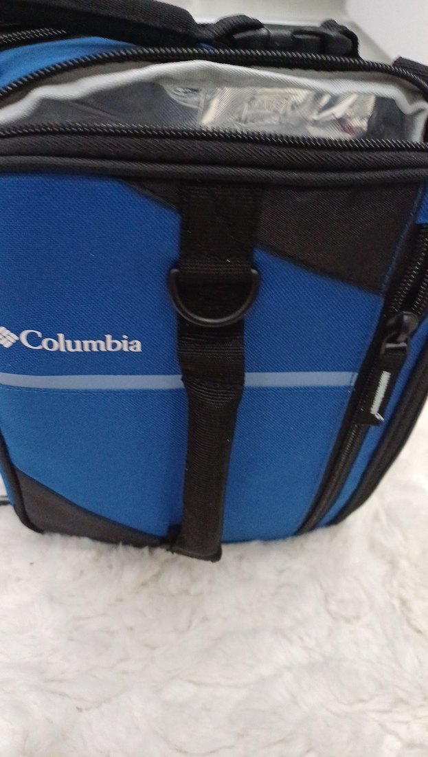 Columbia marka, koyu mavi renkte, sağlam yapılı ve çok bölmeli çantası. buzluklu
