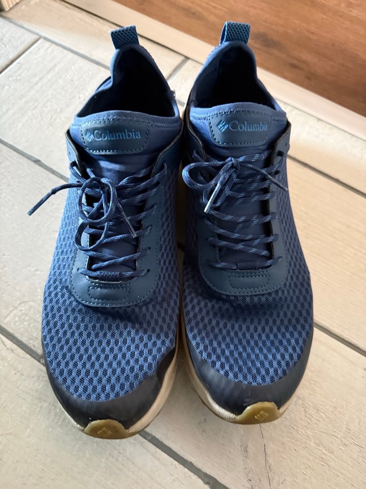 Columbia markalı, lacivert renkte, bağcıklı ve dolgu topuklu spor ayakkabı. Nefes alabilir file üst yüzey ve kauçuk taban içerir.
