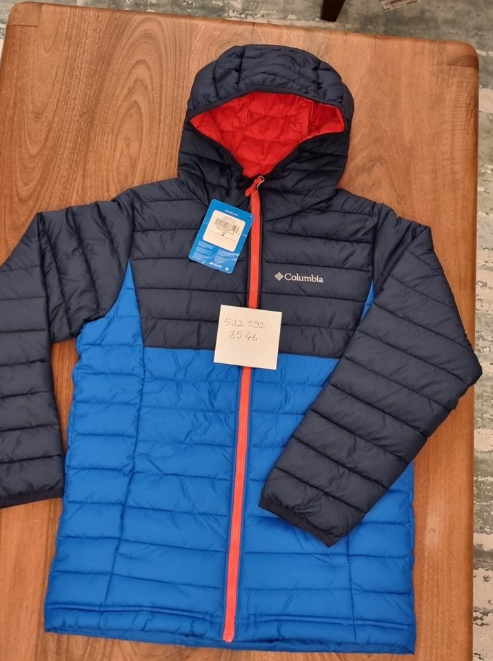 Columbia M beden, kapüşonlu, lacivert ve açık mavi renkte, polyester dolgulu orta kalınlıkta erkek çocuk montu. Hiç kullanılmamıştır, orijinaldir. Boyu Omuzdan itibaren 58 cm, iki koltuk altı 44 cm, Kol boyu 48 cm.