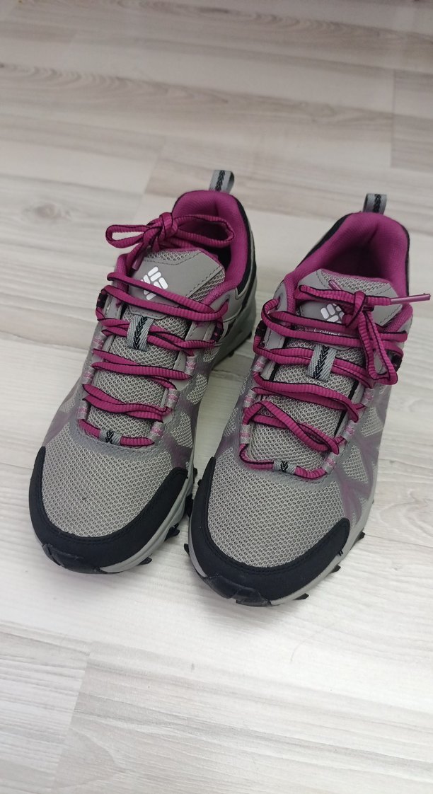 Columbia'nın mor ve gri renkli kadın spor ayakkabısı, baskılı tasarım, kauçuk taban ve cırt cırtlı bant içerir. İnce topuklu olup sokak stili ve açık hava kullanımı için uygundur. ufak defo var görsele eklendi