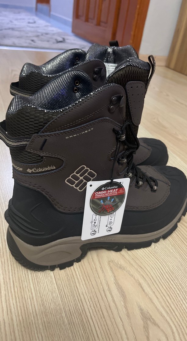 Columbia markalı, dayanıklı kauçuk malzemeden yapılmış, OMNI-HEAT teknolojili kahverengi erkek outdoor botları. Velcro kapanışlı ve baskılı desenlidir.