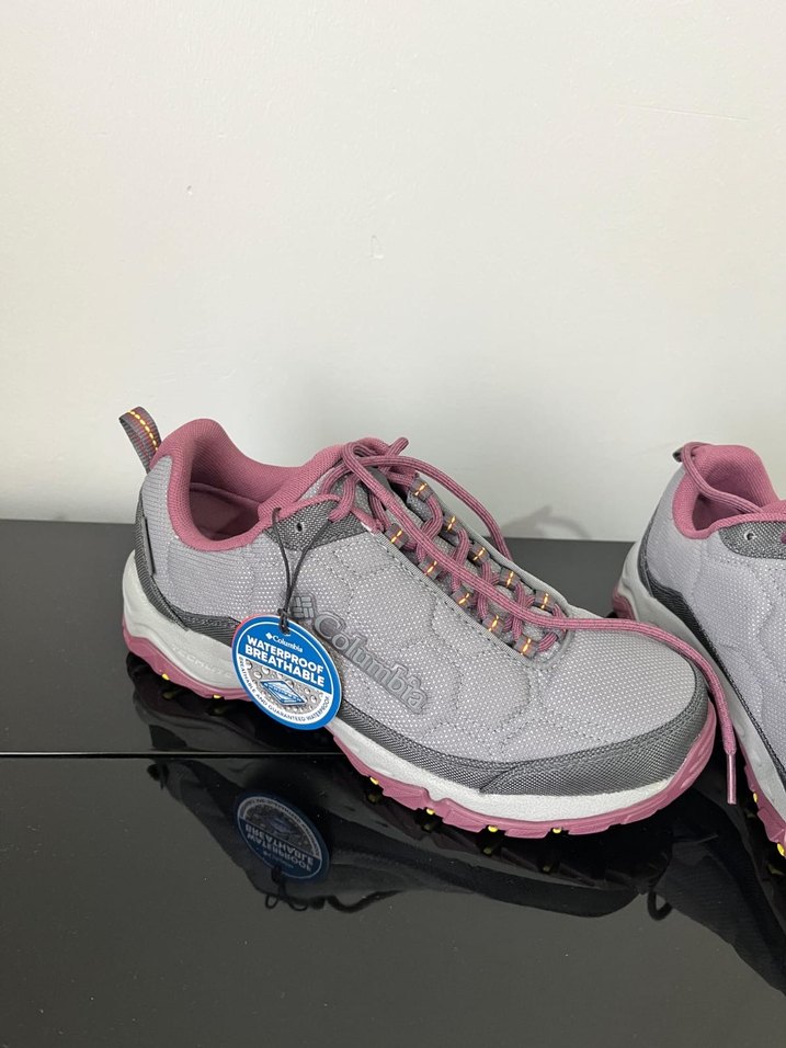 Columbia markalı, bağcıklı, pembe ve gri baskılı kadın spor ayakkabısı. Nefes alabilir kauçuk malzemeden üretilmiş, outdoor kullanıma uygun. Etiketli ürün sadece dar oldu. Kullanılmadı. Orijinal.