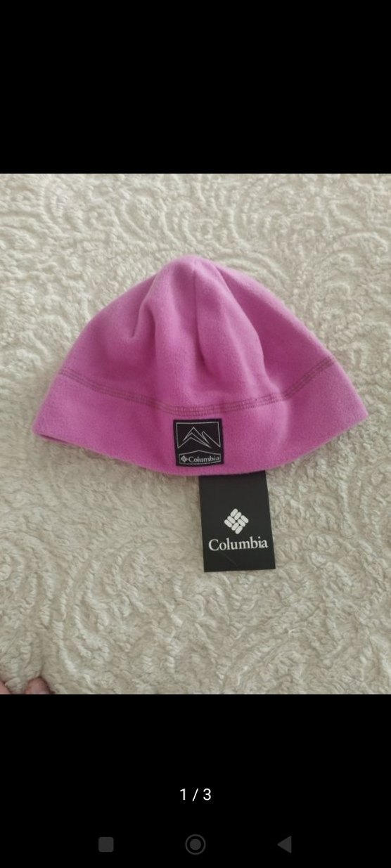 Columbia marka, pembe renkli, renkli baskılı ve Velcro detaylı polar bere. Trendy casual tarzına uygundur.