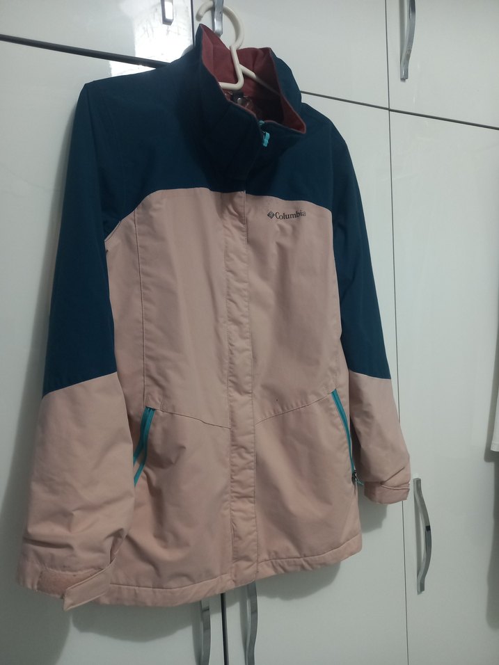 Columbia marka, cep fermuarlı, notalı yaka ve uzun kollu, midi boy, bol kesim kadın ceket. Bej, lacivert ve bordo renk bloklu, yumuşak sentetik kumaştan. ufak kusurları var ama kullanıma engel bir durum yok