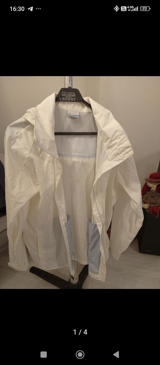 Beyaz renkte, salaş kesim ve uzun kollu kadın Columbia ruzgarlik Notlu yaka ve dökümlü tasarıma sahip, hafif sentetik kumaştan üretilmiştir.