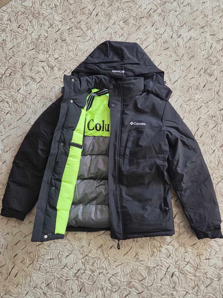 Siyah Columbia kapüşonlu mont, yüksek yakalı ve fermuarlı ceplidir. Yumuşak ve sıcak kumaştan üretilmiş, normal midi boyda ve uzun kolludur.