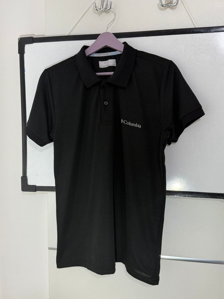 Columbia marka, kısa kollu, düğmeli yakalı, baskılı logolu siyah fitted polo tişört. Sentetik yumuşak kumaştan üretilmiştir.