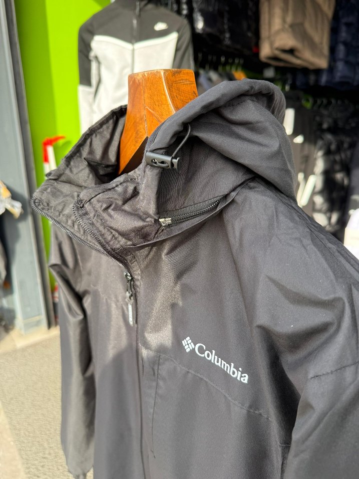 Columbia markalı, fermuarlı, uzun kollu ve yüksek yakalı siyah erkek yağmurluğu. Rahat kesimi ve baskılı tasarımı ile dış mekan kullanımına uygun.