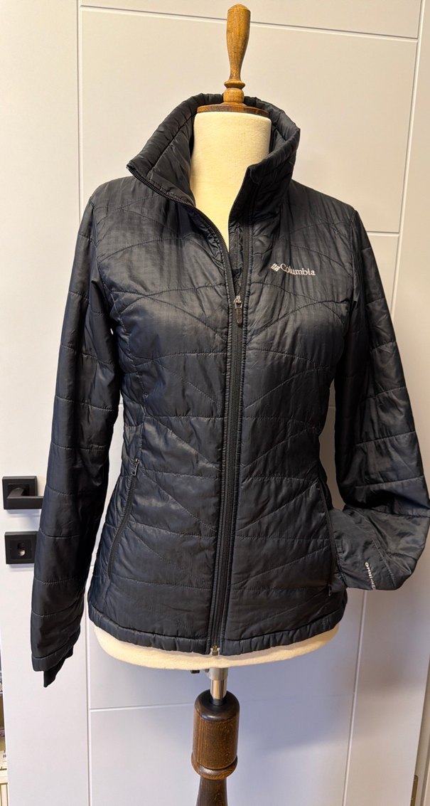Siyah renkli, fermuarlı, uzun kollu, sentetik kumaştan yapılmış, günlük kullanıma uygun, kadınlar için dar kesim mont.