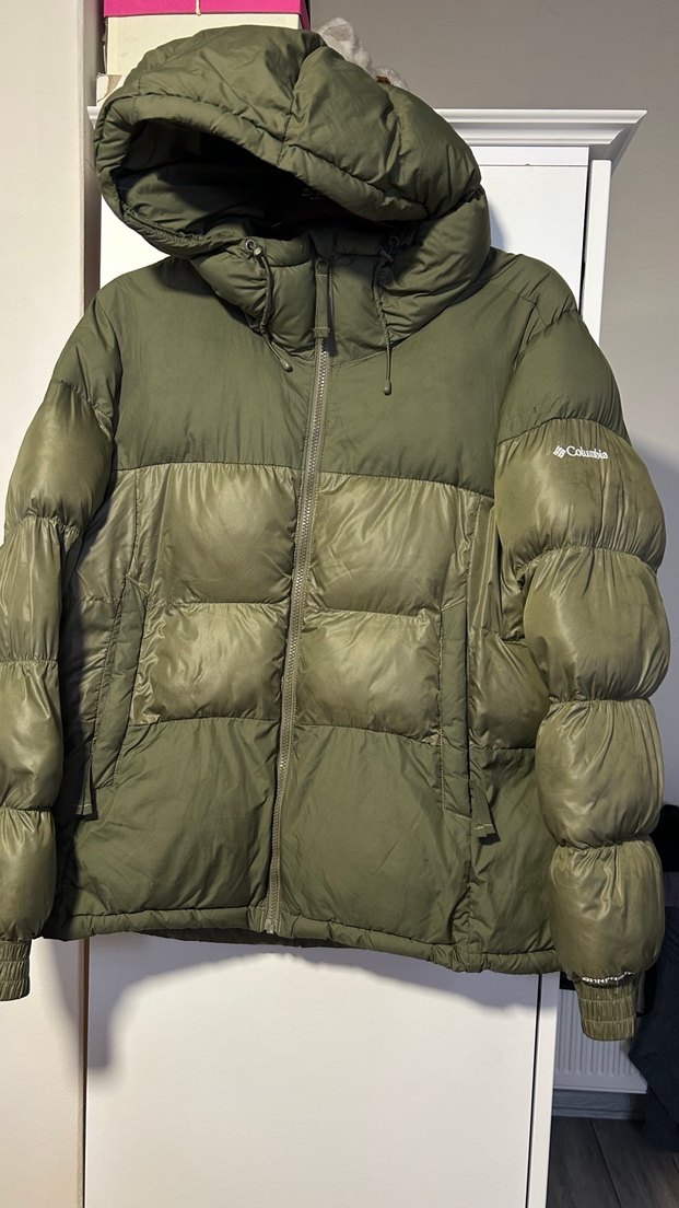 Fermuarlı ve askılı kollu, parlak yeşil renkli, rahat ve yumuşak dokulu erkek mont. Normal uzunlukta, cok sıcak tutuyor. kolunda yagmur lekesi var cok az belli bile olmuyor fotografini koydum