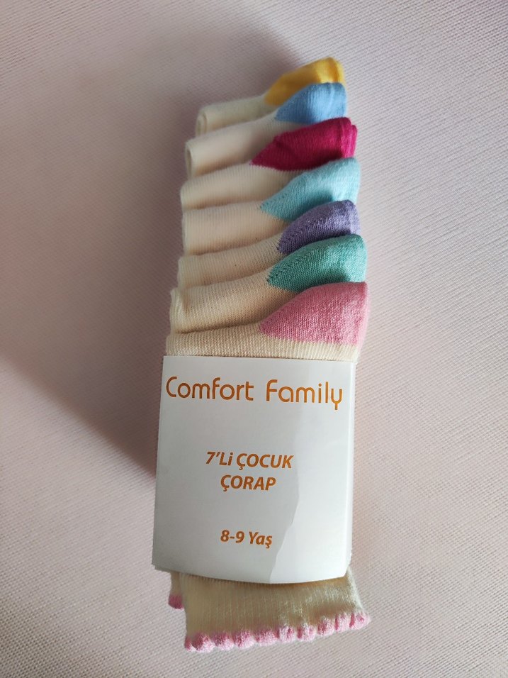 Comfort Family markasının 8-9 yaş kız çocukları için pamuklu, pastel renkli çoklu 7'li çorap seti.
