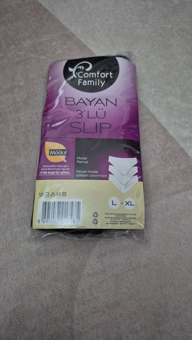 Comfort Family marka bayan 3'lü slip iç çamaşırı, yumuşak modal ve pamuk karışımı kumaştan, L-XL beden, bej ve gri renklerde basılı desenli.