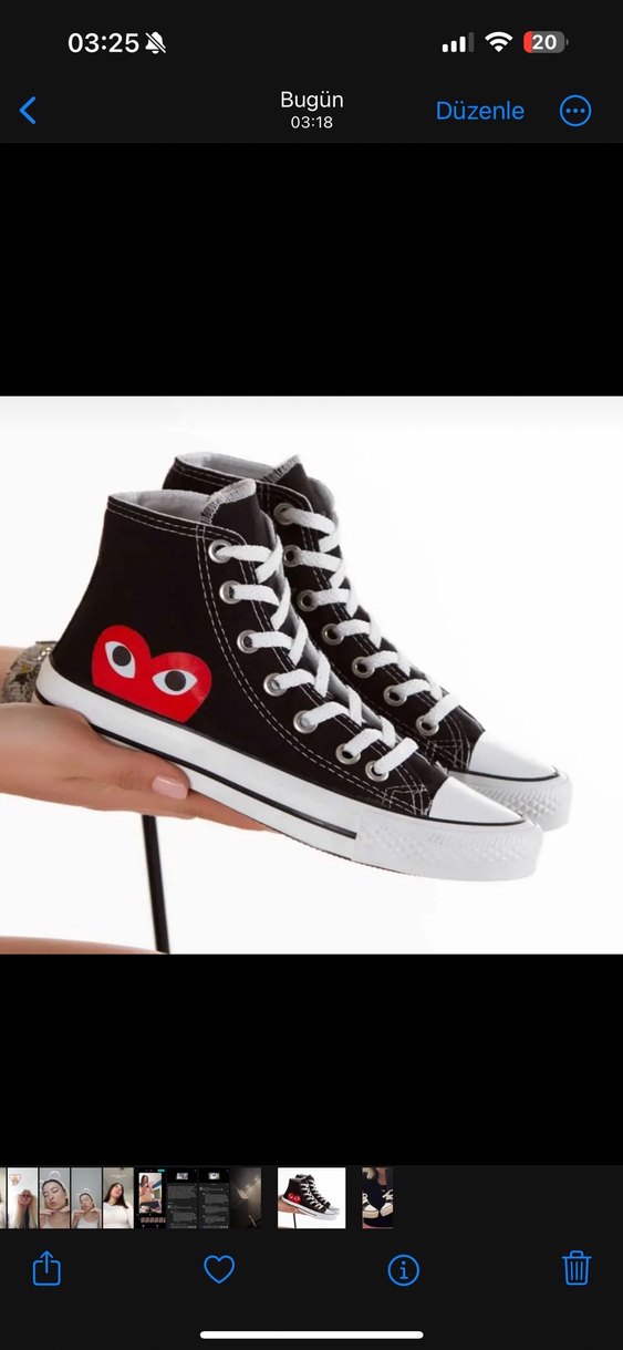 Siyah renkte, kırmızı kalp baskılı ve beyaz bağcıklı yüksek spor ayakkabılar. Kauçuk taban ve elastik detay içerir, günlük kullanım için uygun. 1 kez kullandım. sorunsuz.