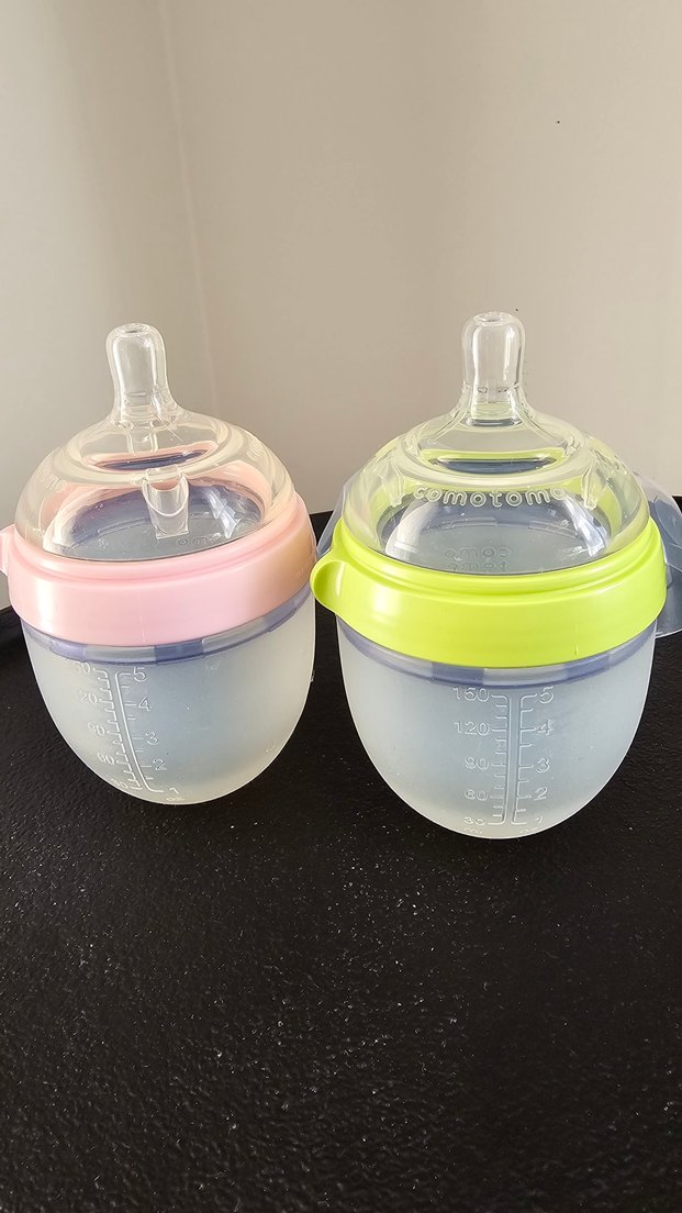 Pastel pembe ve yesil renkte, yumuşak emzikli ve ölçü işaretli bebek biberonu. Gövdesi bpa onaylı silikondur ve yuvarlak yapida olmasi bebekler tarafından rahat tutus sağlıyor. markayi meme reddi yaşanmaması nedeni ile tercih etmiştim cok memnun kaldim muhakkak araştırın. philipsi de kullanan biri olarak como tomo yu tek gecerim.İlk uçlarından sonra 6+ yani hızlı akış gösteren biberon ucuna değişim yaptım ama hic kullanmadım. çünkü ürün geldikten sonra bebeklerime anne sütünü artirip mamayı bıraktırdım başlığı açtığım icin elimde kullanilmadan kaldı. biberon uçlarına dikkat ederseniz kullanılmadığı belli olacaktır parlak ve ciziksiz..sadece bu tarz ürünler durdukça renk değişimi oluyor. Bir tanesinin kapağında minik bir çizik var kullanıma engel değil. tekli fiyatıdır. biberon ucu ve kendisini düşünürsek oldukça uyguna vermiş oluyorum.