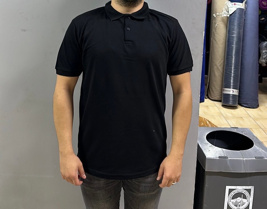 Erkek siyah polo tişört, kısa kollu ve yakalıdır. Sentetik kumaştan üretilmiş, rahat kesim ve desen içermeyen sade bir tasarıma sahiptir. Günlük kullanıma uygundur.