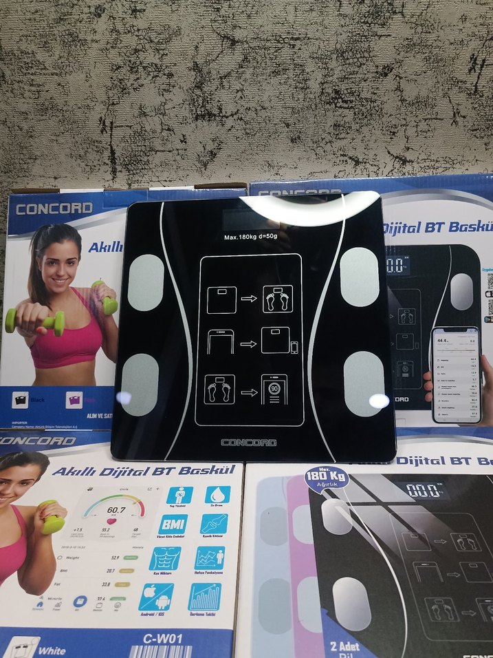 Concord dijital akıllı baskül C-W01, 180 kg kapasiteye sahip, dört sensörlü siyah tasarım ve mobil uygulama bağlantısıyla vücut analizini kolayca yapar.
