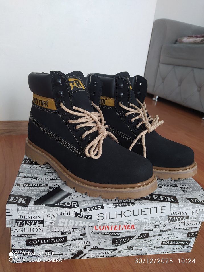 Siyah bağcıklı erkek botları, dayanıklı kauçuk malzemeden, baskılı detaylarla günlük sokak giyimine uygun. ürün sıfırdır çok şık ve kaliteli bir bot. oğluma hediye geldi numarası uymadığı için satılık.