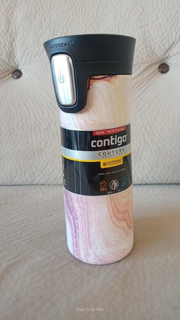 Bej renkli Contigo Couture termos matara, dökülmeyi önleyen AUTOSEAL kapaklıdır. 420 ml kapasite ile içecekleri 5 saat sıcak, 12 saat soğuk tutar.