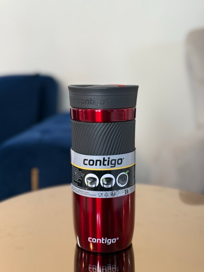 Contigo termos matara kırmızı gövde ve gri kapak ile uzun süre sıcak tutar. Kullanımı kolay ve güvenli kapak sistemi bulunur.