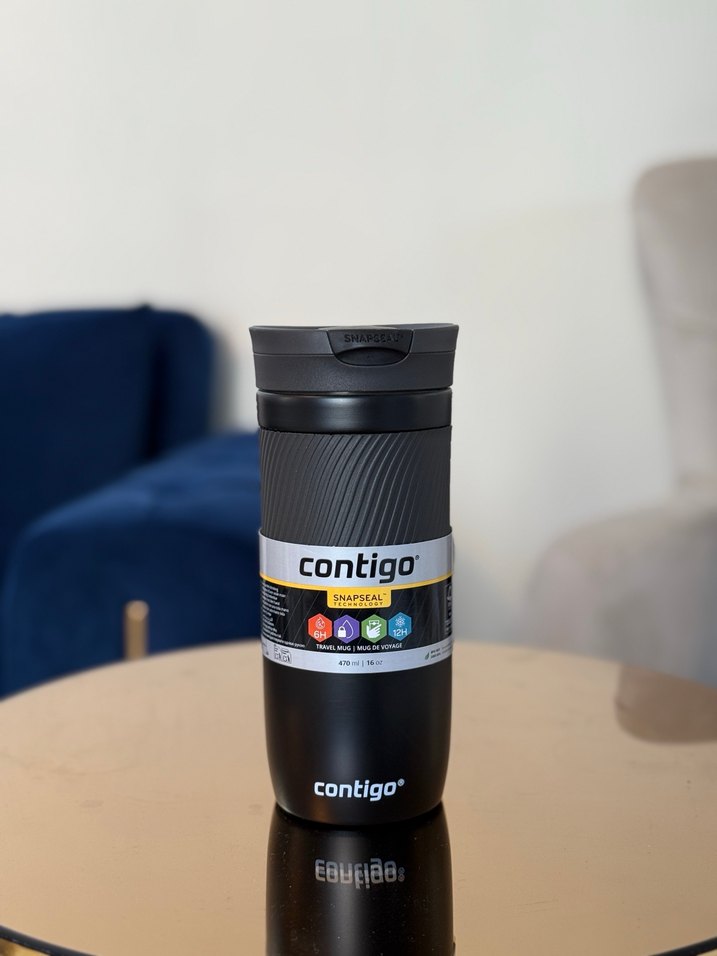 Contigo siyah termos matara, kolay kullanım için dokulu tutma yüzeyi ve snap-seal kapak içerir. İçecekleri saatlerce sıcak veya soğuk tutar.