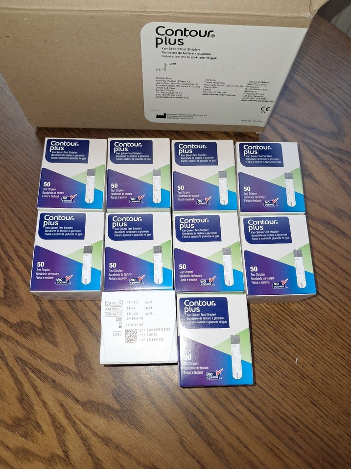 Contour Plus glikoz ölçüm test şeritleri, 50 adetlik paketlerde sunulmaktadır. Deve tüyü renkli ambalajı kolayca tanınır. OCR metni "Contour., tour, DlUS" olarak okunmuştur. son kullanma tarihi 28 02 2026