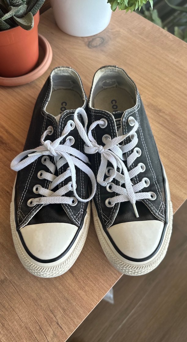 Bağcıklı, düz tabanlı, siyah beyaz kauçuk spor ayakkabı. Günlük kullanıma uygun rahat ve sade tasarım. Orginal converse mağazadan aldım. Herhangi bir yırtık yok. Tabanda açılma yok. Kumaşta kullanıma bağlı renk değişimi var#Converse