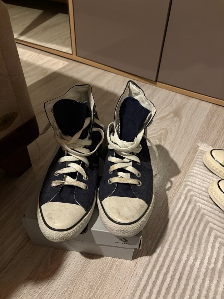 Mavi ve gri renkte, düz kauçuk tabanlı, günlük kullanım için rahat ve şık spor ayakkabılar.
