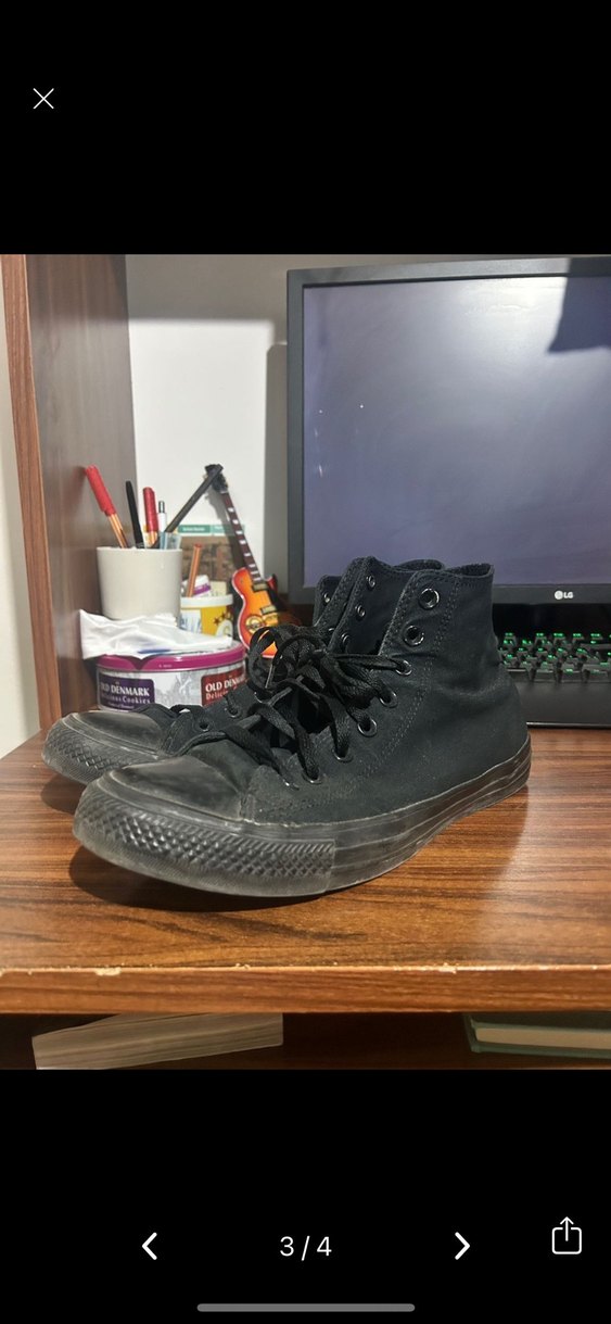 Düz siyah kauçuk tabanlı, yüksek bilekli spor ayakkabılar. Grunge punk tarzıyla günlük kullanıma uygun, zahmetsiz şıklık sunar.